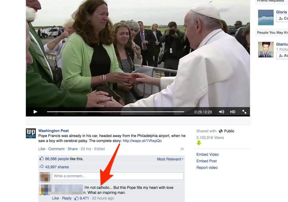 Ayer el Washington Post, un periódico bastante laico, publicó un video donde se ve al Papa parando su automóvil y besando a un niño enfermo en medio de su visita a los Estados Unidos. El post fue compartido 44,949 veces y comentado 3,433. Me puse a leer los comentarios y me llamó mucho la atención que la gente empezaba sus opiniones sobre el video con el siguiente estribillo: “No soy católico pero…” He recopilado rápidamente algunas de las frases que cientos de personas no católicas publicaron en este post para que veamos cuál está siendo la resonancia del viaje del Papa Francisco entre los no católicos de ese país.